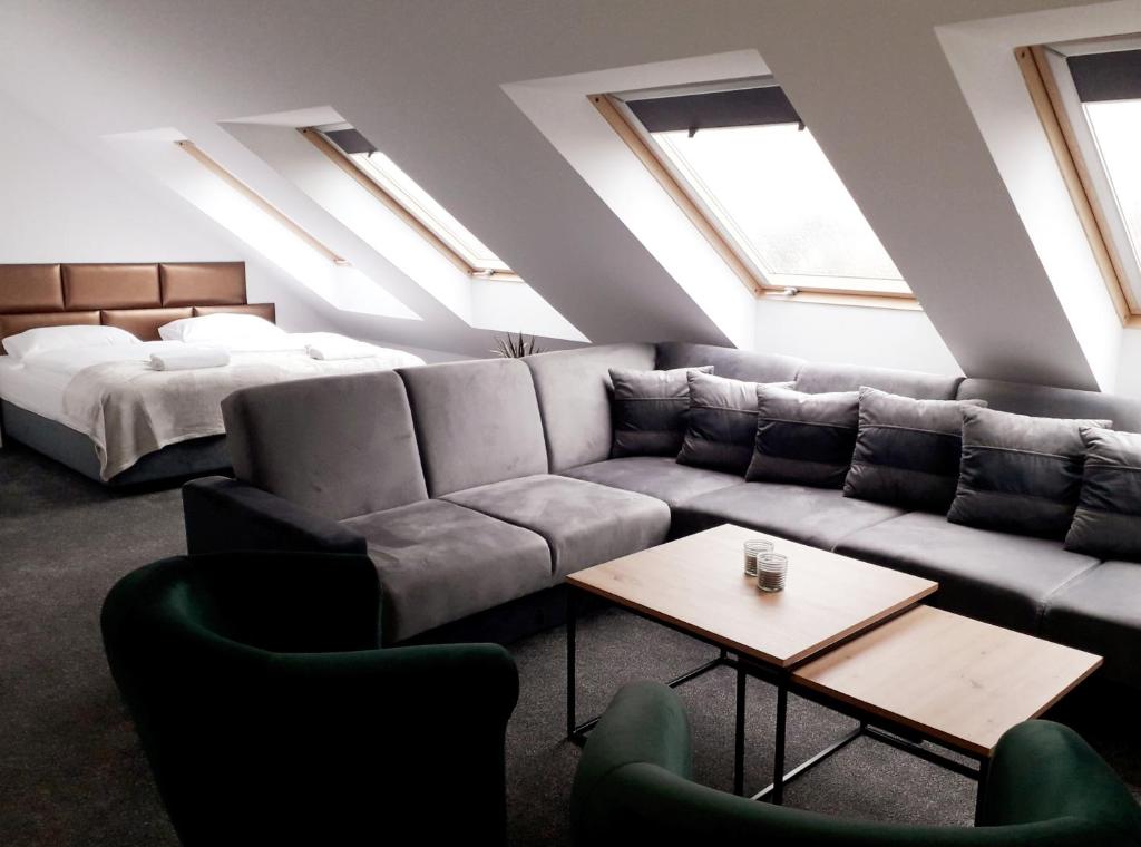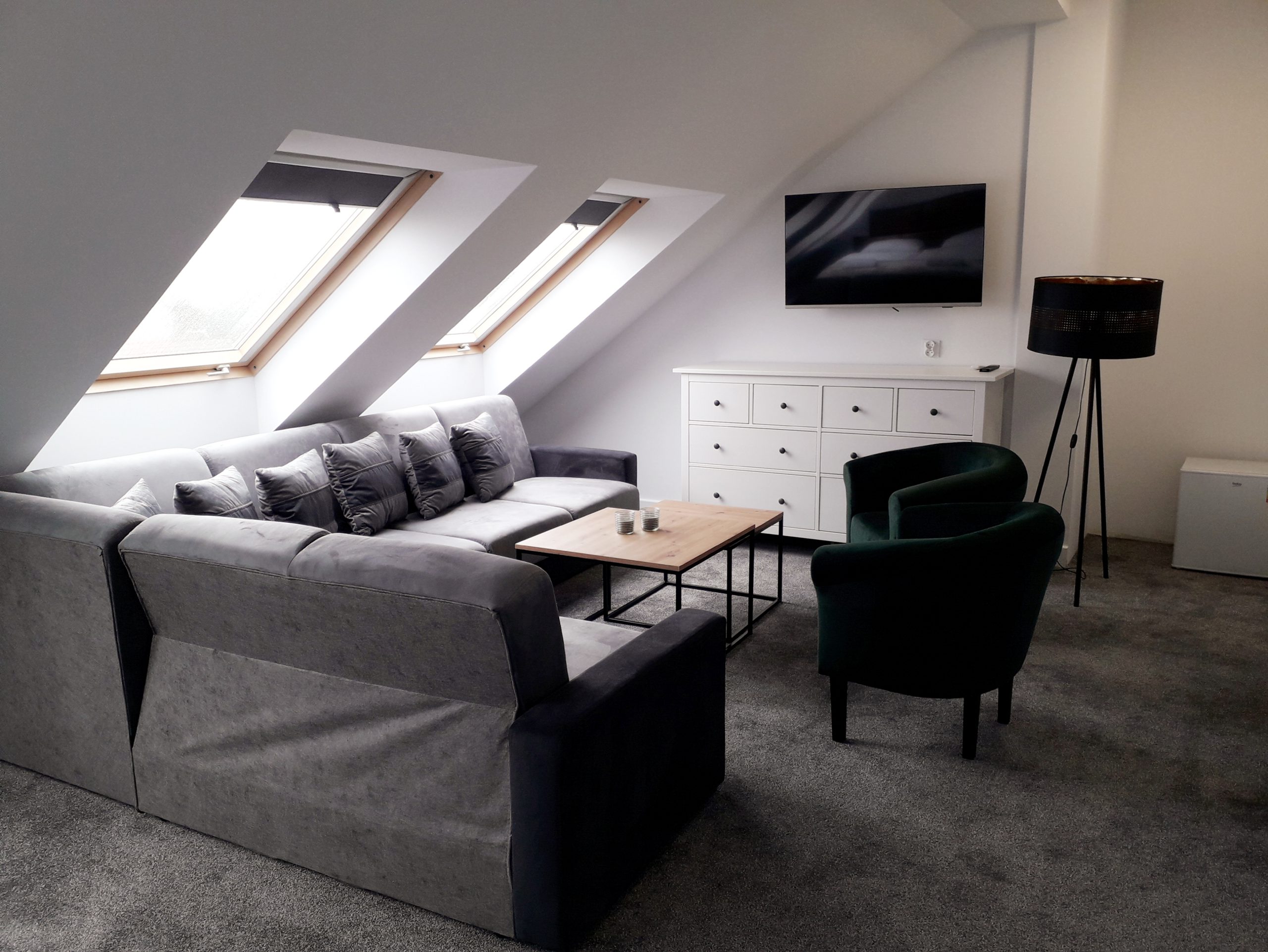 Przestronny, nowoczesny pokój z wydzieloną strefą wypoczynkową. Znajduje się w nim łoże małżeńskie oraz duża narożna sofa z funkcją spania. Idealny dla 4 osób dorosłych lub rodzin z dziećmi.